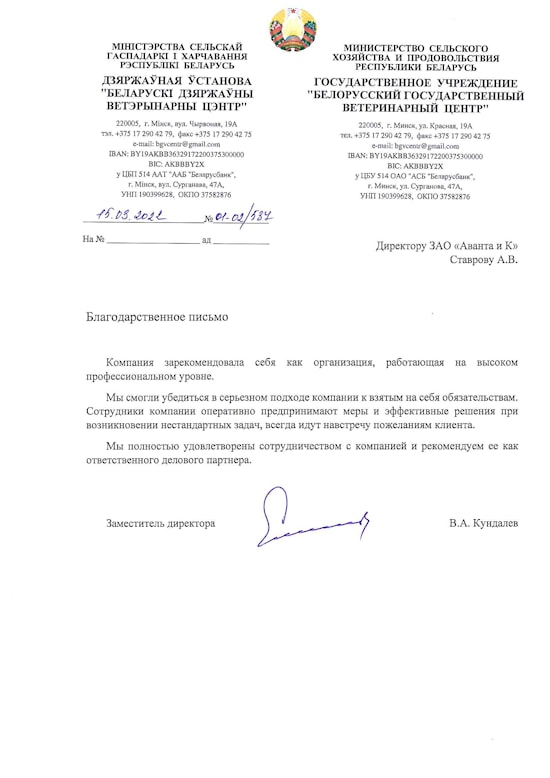 Отзыв от ГУ "Белорусского государственного ветеринарного центра"