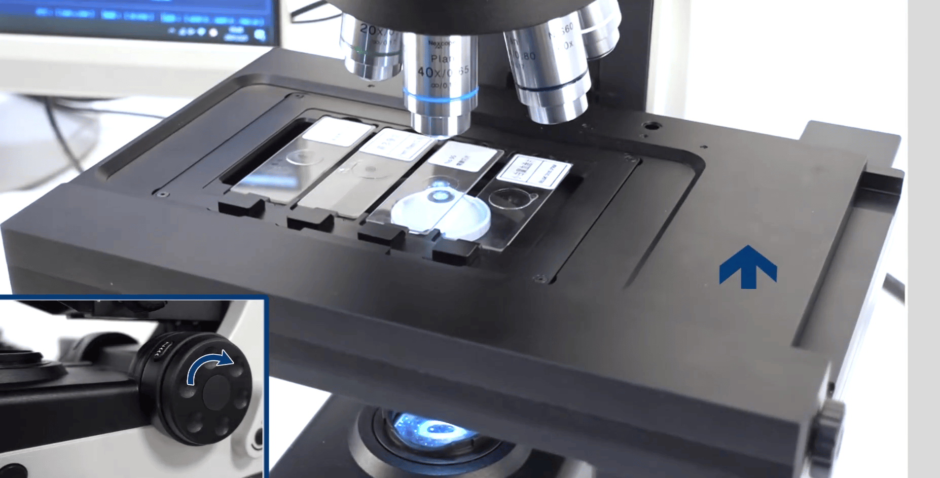 При смене объективов работает система защиты объективов - стол отодвигается вниз, чтобы не повредить препараты и объективы при смене, а затем возвращается в точку фокуса.