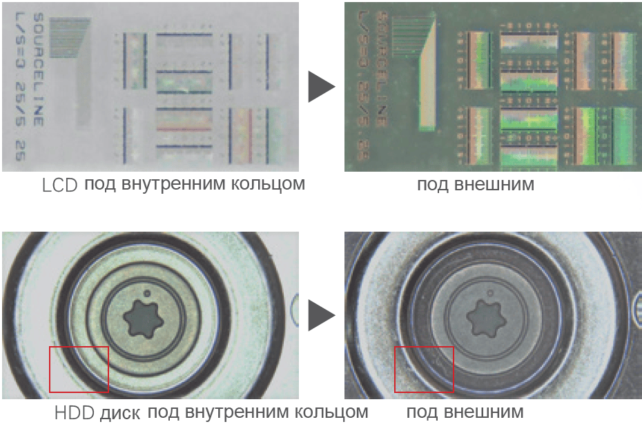 - Кольцевая LED лампа с двумя отдельно регулируемыми кругами ламп для получения больших деталей объекта. Внешний круг выступает в роли падающего освещения, а внутренний в роли коаксиального свет а, что позволяет получить более детальные снимки интересующих областей.