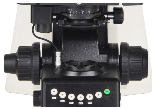 Объективы можно переключать, нажимая клавиши на передней панели микроскопа. Пользователи также могут самостоятельно определять два наиболее часто используемых объектива и переключаться между ними, нажимая зеленую клавишу.